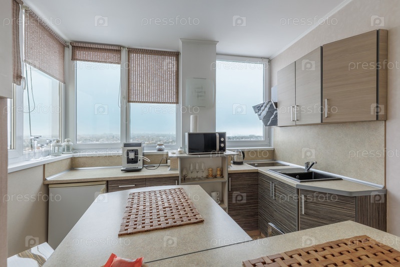 Современный дизайн кухни в светлой квартире с деревянными шкафами, легкой столешницей и завтраковым баром с бамбуковыми ковриками. Полностью оборудованное пространство с кофемашиной, микроволновой печью и чайником. Минималистический городской плоский инте