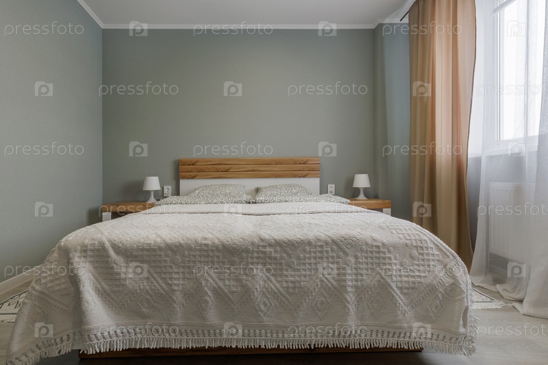 Фронтальный вид минималистической спальни с белой кроватью с деревянной головкой, двумя сочетающимися ночными столами с лампами и зелеными стенами.Уютная атмосфера с нейтральными вязаными текстилями и естественным светом из окна с бежевыми шторами