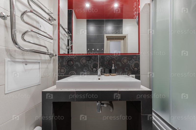 Современный дизайн ванной комнаты с белой квадратной раковиной на консоли с черными плитками. Стильный интерьер с красным глянцевым потолком, большим зеркалом, хром-оттягивателем для полотенцев и декоративными мозаичными черепицами. Минималистское и чисто