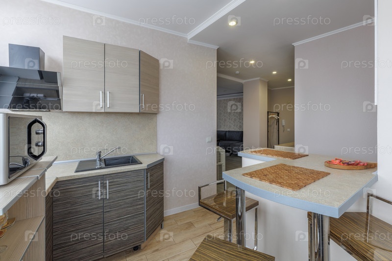 Современный дизайн кухни в квартире-студии с седыми деревянными шкафами, легкой столешницей с раковиной и завтраковым баром. Яркое минималистическое пространство со современными бытовыми приборами, микроволновой печью и стильными стульями в интерьере нейт