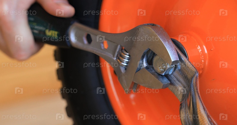 Затягивание гайки разводным ключом. Сборка строительной тачки