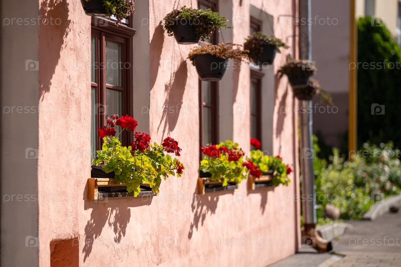 Очаровательный розовый фасад европейского здания, украшенный цветущими красными гераниями в оконных ящиках и висящими горшками. солнечная архитектура старого города создает теплую живописную летнюю сцену