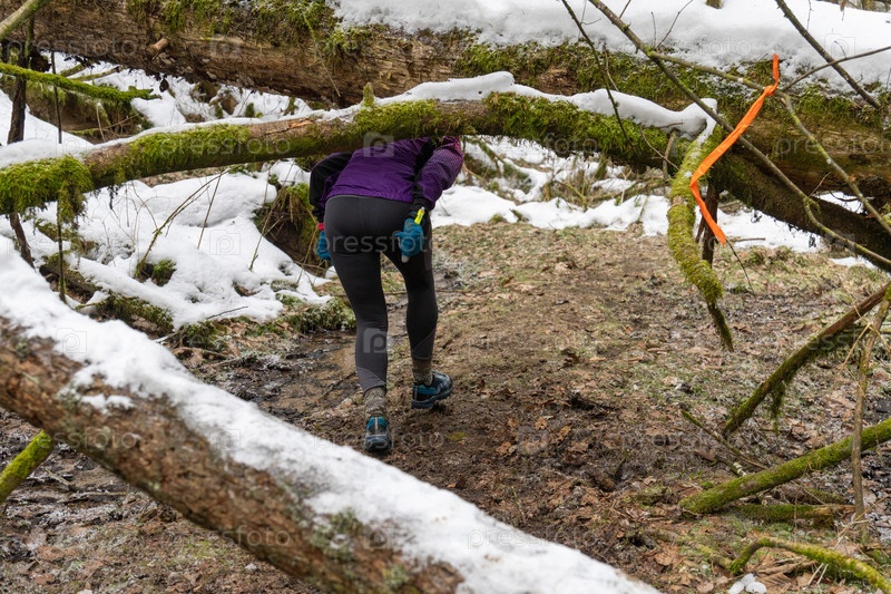 Женщина-спортсменка в фиолетовом снаряжении катается под моховыми, заснеженными бревнами во время зимней гонки на тропах