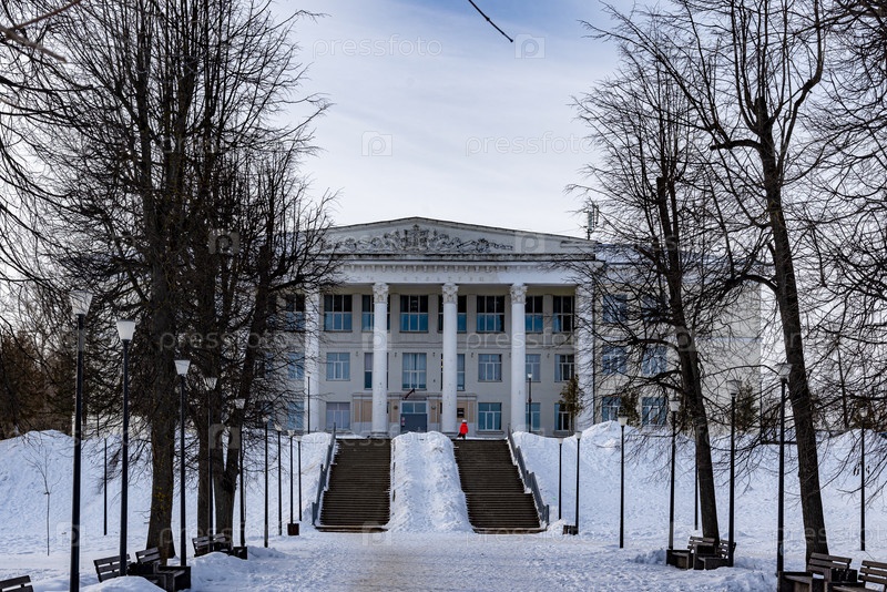 Элегантное историческое здание Дома культуры, окруженное заснеженным парком
