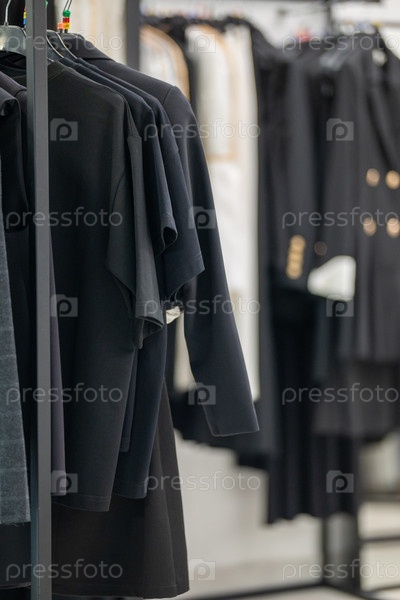 Черная одежда висит на металлических стеллажах в современном магазине розничной торговли. монохромный дисплей одежды с размытым фоном, показывающий больше одежды и теплое освещение