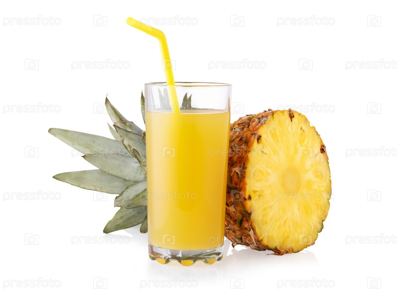 Свежий ананасовый сок в стакане и анал, нарезанный пополам, изолирован на белом фоне