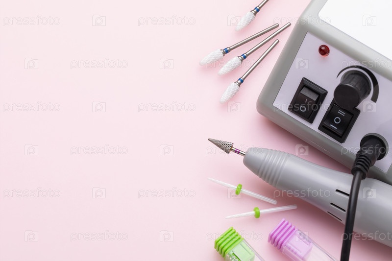 Различные керамические резалки для аппаратного маникюра с копировальным пространством на цветном розовом фоне