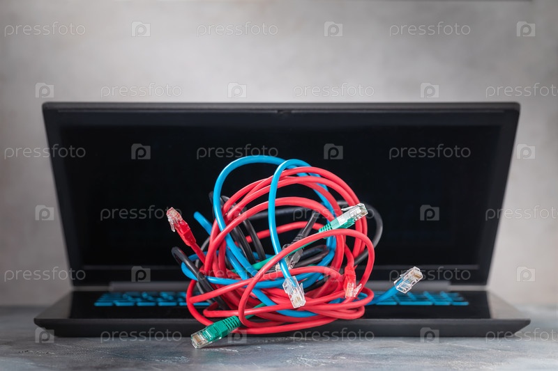 Куча сетевых компьютерных проводов на ноутбуке, концепция о сложности подключения к локальной сети или Интернету