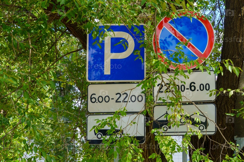 Городской пейзаж. Дорожные знаки 6.4. "Парковка", 3.28 Запрещено парковаться и 8.5.4
