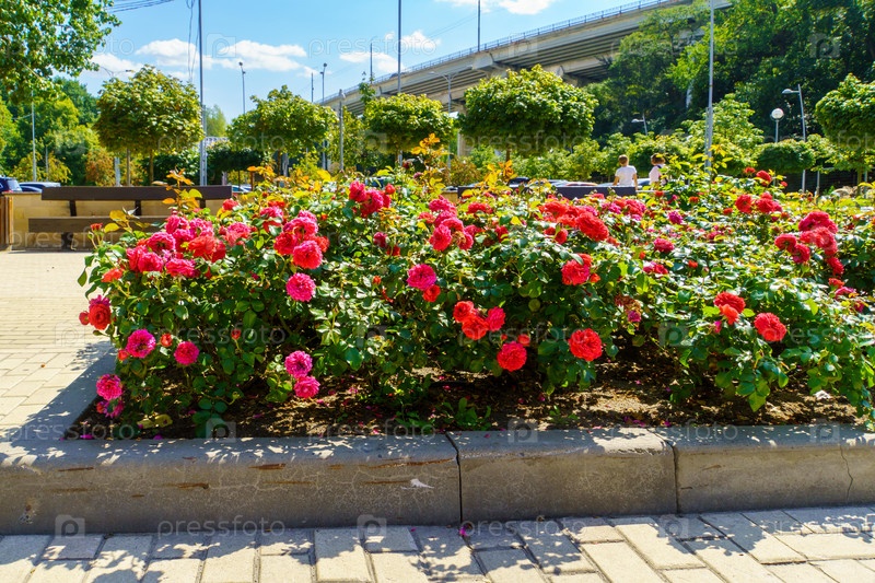 Городской пейзаж. Розы на клумбе в центральном парке. Воронеж