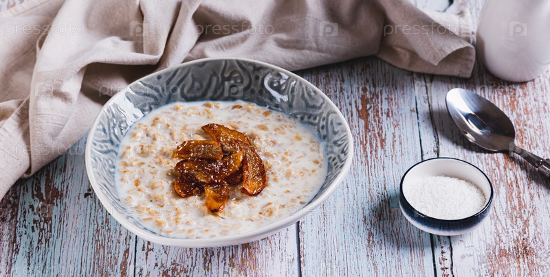 Овсянка с карамелизованными яблоками и кокосовыми хлопьями в миске на веб-баннере стола