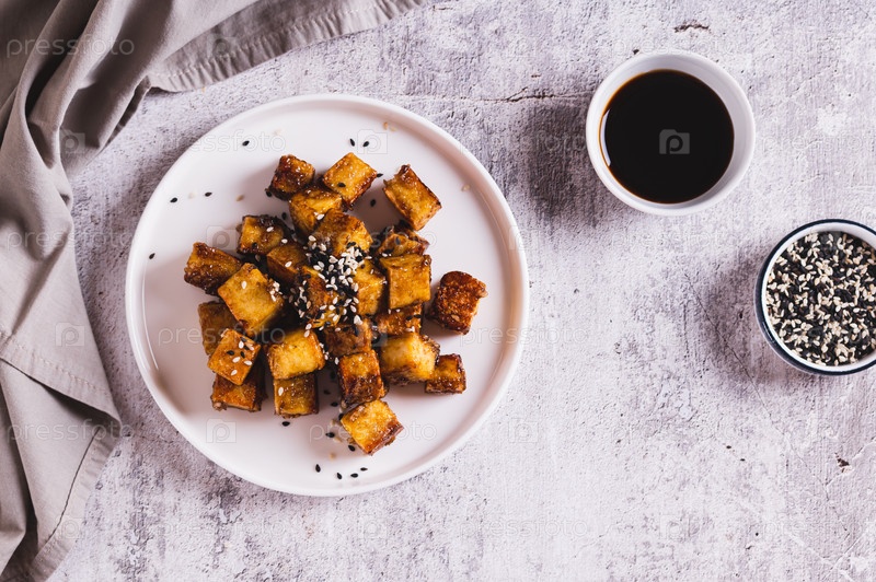 Жареное тофу в соевом соусе и кунжутных семенах на тарелке на столе