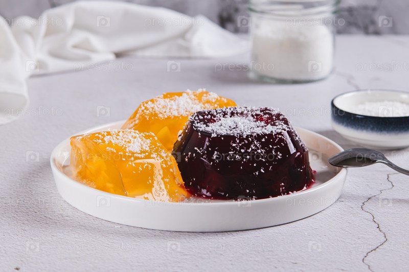 Сладкое фруктовое желе в кокосовых хлопьях на тарелке за столом