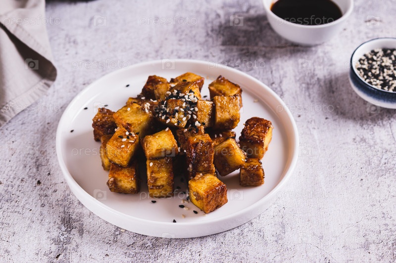 Кубики жареного тофу в соевом соусе с чесноком и кунжутом на тарелке за столом