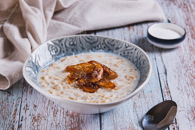 Овсянка с карамелизованными яблоками и кокосовыми хлопьями в миске на столе