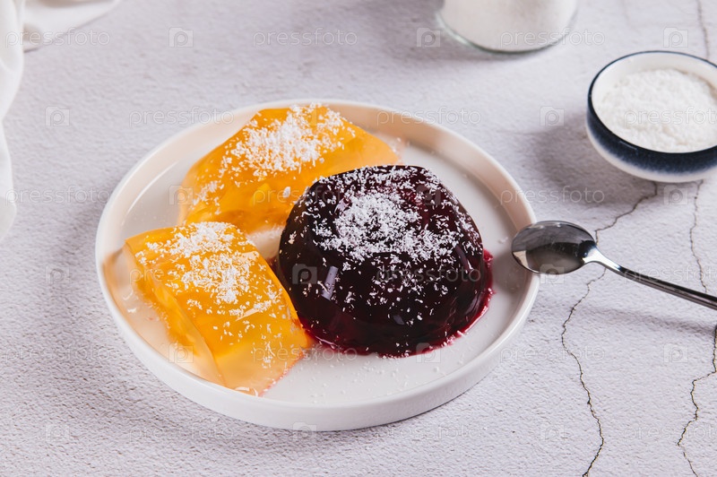Желатиновый десерт из желтого и красного фруктов на тарелке за столом
