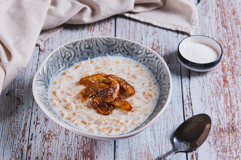 Овсяная каша с нарезанными яблоками в меде в миске на столе