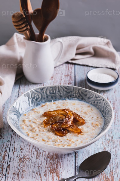 Овсянка с карамелизованными яблоками и кокосовыми хлопьями в миске на столе вертикальный вид