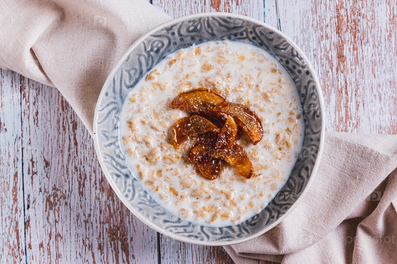 Близкий снимок овсяной муки с карамелизованными яблоками и кокосовыми хлопьями в миске сверху