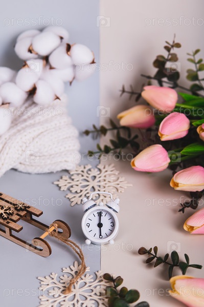 Концепция весеннего равноденствия, время между снегом и цветами вертикальный вид