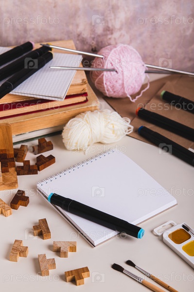 Набор предметов для творчества и досуга на столе вертикальный вид