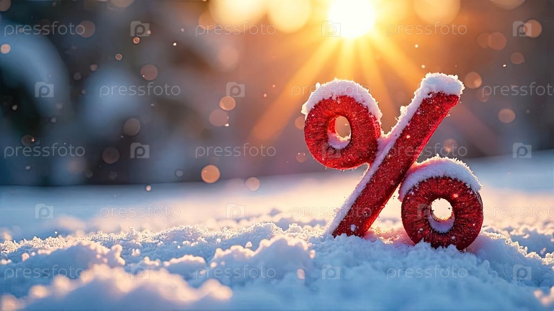 Красный процентный знак на снежном фоне снаружи, блеск и снежинки и солнечные лучи. Зимняя распродажа и скидки, Черная пятница, Новый год, Рождество. баннер, флаер с копировальным пространством. ИИ генерируется
