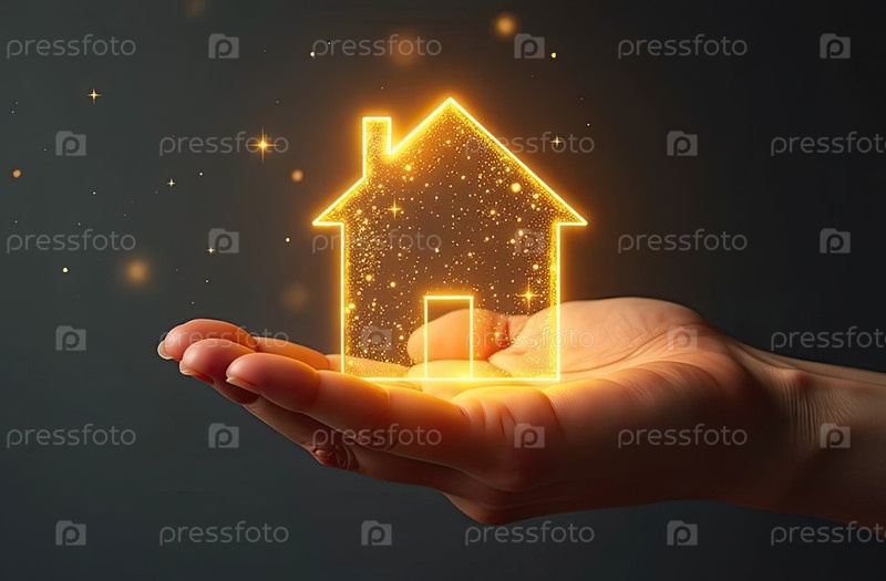 Золото светящийся символ уютного дома В ладонях рук с золотым блеском. Недвижимость, риэлтор, ипотека, страхование, бронирование, изоляция, мечта о собственном доме. ИИ генерируется