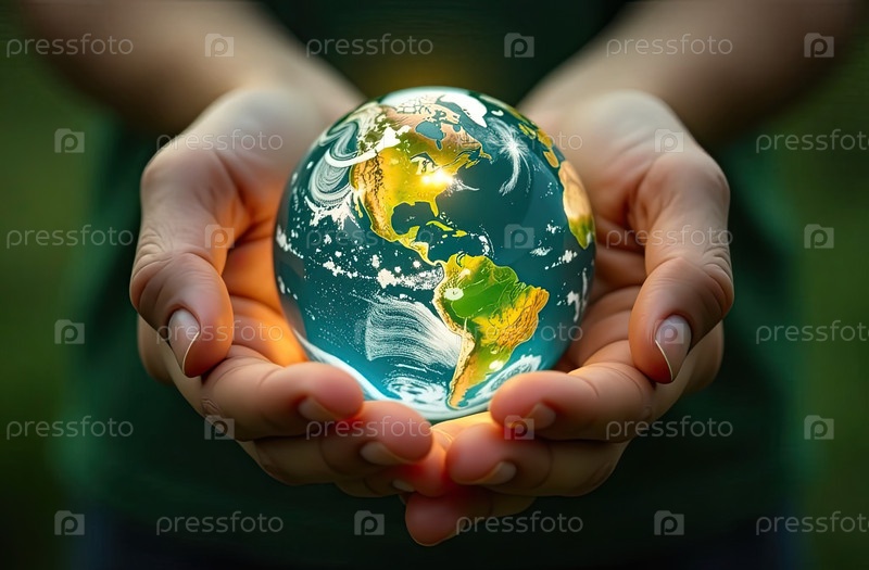 Стеклянная светящаяся сфера планеты Земля На ладонях находится шар с внутренним микроклиматом, заботой о планете, чистой окружающей среде, защитой экологии, географии, континентов, путешествий