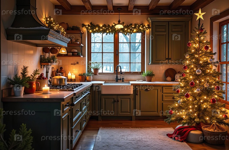 Рустический интерьер уютной современной рождественской кухни, новогоднее настроение, подготовка к празднику, посуда. Рождественский декор современной кухни с приготовленным ужином. ИИ генерируется