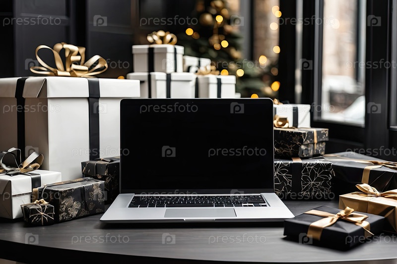 Макет ноутбука с черным экраном на столе в офисе с коробками для подарков сотрудникам, магазины, корпоративные подарки, Черная пятница, Рождество и Новый год