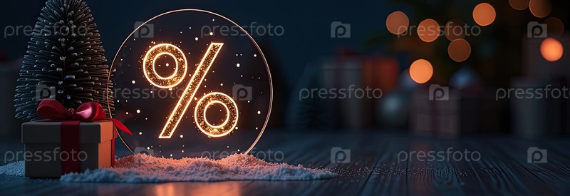 Неон светящийся золотой процентный знак на рождественском фоне с елкой, блесками и коробками для подарков. Черная пятница, Новый год, Рождественская распродажа, скидки. баннер, флаер с копировальным пространством. ИИ генерируется