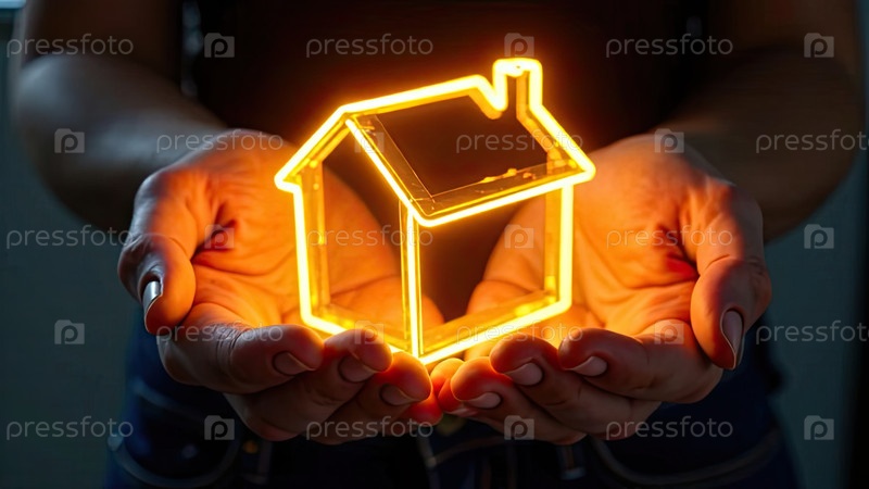 Золото светящийся символ уютного дома В ладонях рук с золотым блеском. Недвижимость, риэлтор, ипотека, страхование, бронирование, изоляция, мечта о собственном доме. ИИ генерируется