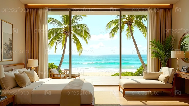 Интерьер гостиничного номера с видом на океан для пляжного отдыха и путешествий