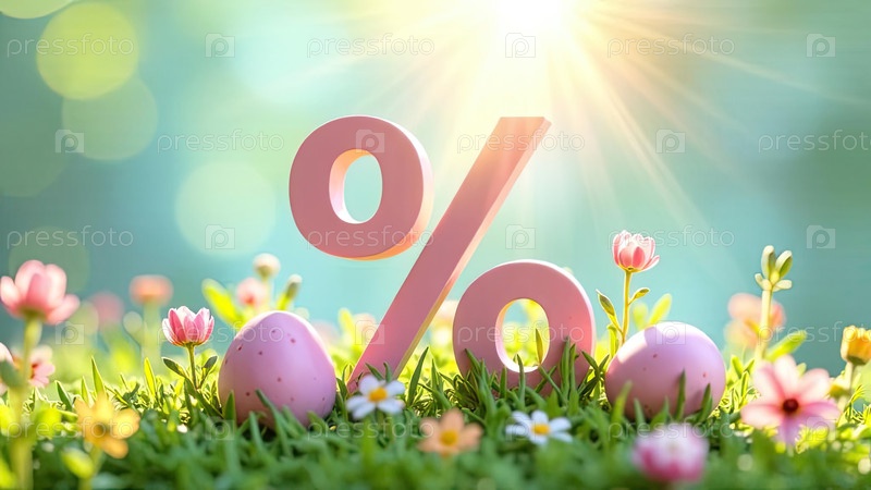 Процентный знак и пасхальные яйца в солнечных лучах, украшены весенними пастельными цветами