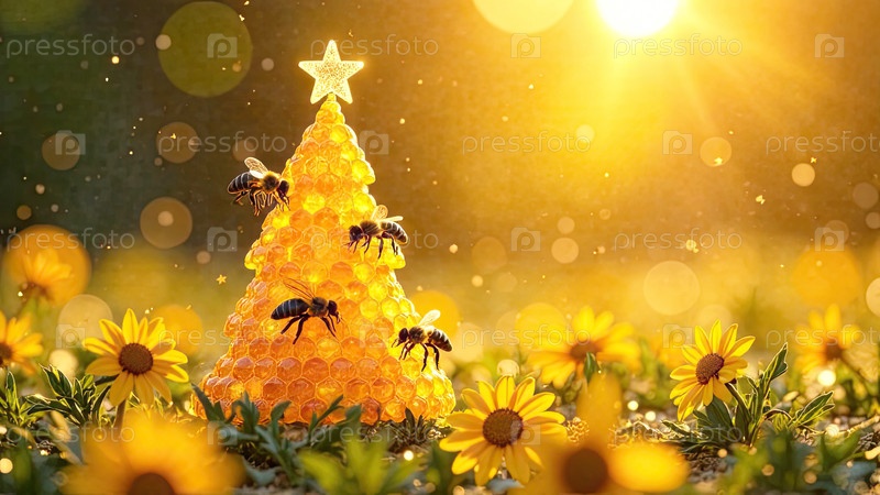 Мед в сосудах в форме конуса рождественской елки с пчёлами на летнем поле под солнечным светом.Пчеловодство, Рождество, Новый год.Искусственный интеллект создан