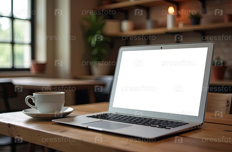 Ноутбук с белым экраном макет на фоне кафе в стиле лофт со стаканкой кофе на столе. удаленная работа, интернет, покупки. ИИ генерируется
