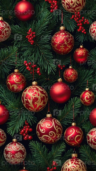 Рождественская открытка с рисунком красных рождественских шаров с елкой. созданный ИИ