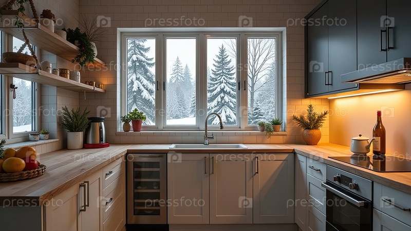 Верхний интерьер уютной современной рождественской кухни, новогоднее настроение, подготовка к празднику, посуда. Рождественский декор современной кухни, снег снаружи окна. ИИ генерируется