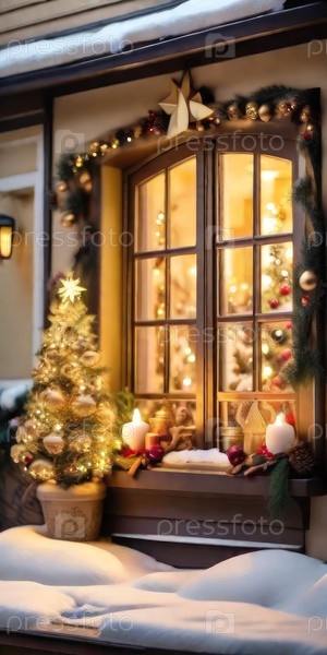 Уютное окно с рождественским декором и теплым светом внутри - вид снаружи дома. отпразднуйте Рождество и Новый год, елку, боке, снег. ИИ генерируется