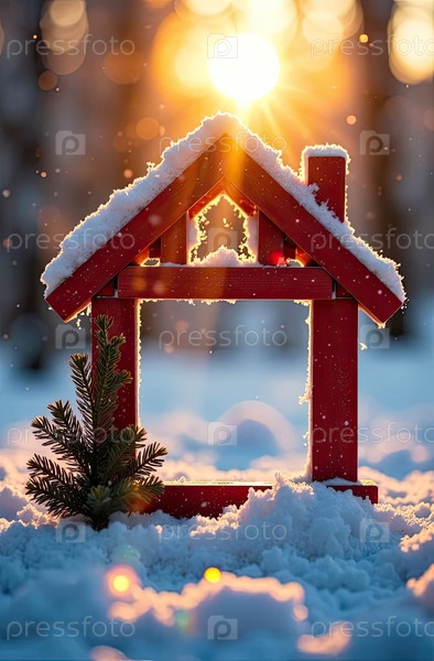 Уютный каркас крошечный дом на снегу и заснеженном фоне в солнечных лучах, с рождественским декором. недвижимость, риэлторская деятельность, ипотека, страхование, бронирование, зимовка, изоляция, отопление. ИИ генерируется