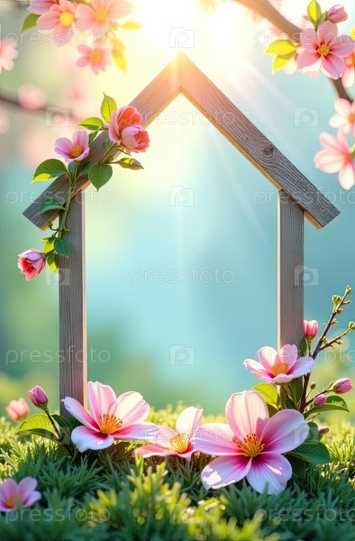 Домашняя декоративная рама в солнечных лучах, украшена весенними пастельными цветами на весенне-синем фоне. недвижимость, риэлтор, ипотека, страхование, бронирование, строительство, изоляция. AI generated