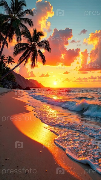 Красный закат на райском океаническом побережье с тропическими пальмами и волнами серфинга. Баннер для турагентства, горящий тур, туристический отдых в отеле. ИИ генерируется
