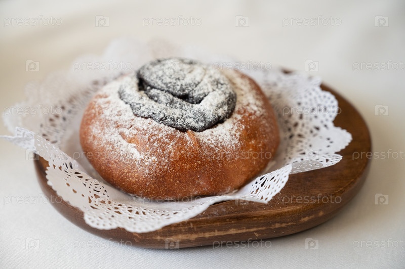 Свежевыпеченный бутерброд с маковыми семенами, покрытый сахаром в порошке, подается на деревянной тарелке с кружевным салфеткой в уютной минималистической обстановке
