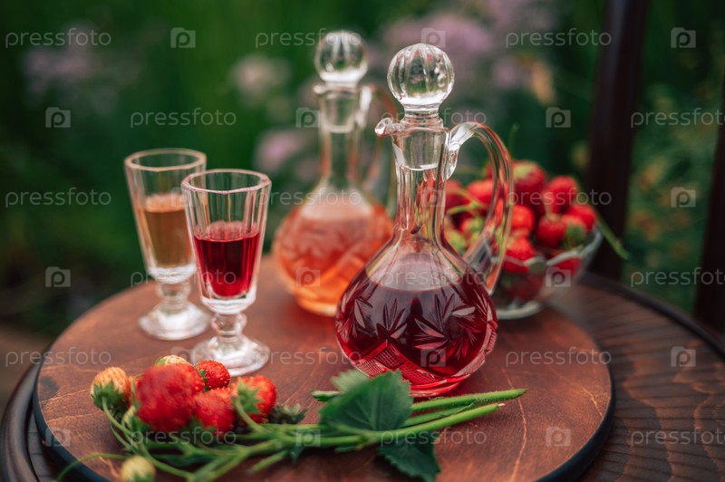 Кристалловые декантры со клубничным ликером и бокалами, установленными на деревянном столе, украшенным свежими ягодами в естественной гардеробе