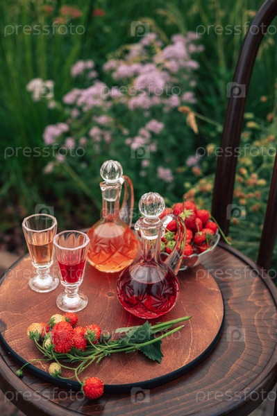 Кристалловые декантры со клубничным ликером и бокалами, установленными на деревянном столе, украшенным свежими ягодами в естественной гардеробе