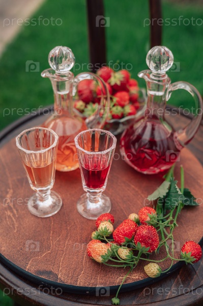 Ягодный ликер в элегантных стеклянных декантерах на открытом воздухе