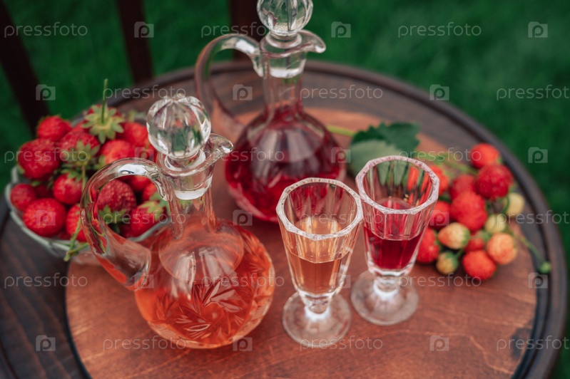 Кристалловые декантры со клубничным ликером и бокалами, установленными на деревянном столе, украшенным свежими ягодами в естественной гардеробе