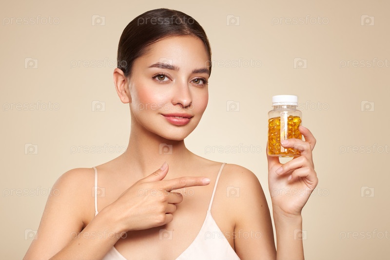 Красивая девушка с таблеткой с маслом печени трески Омега-3