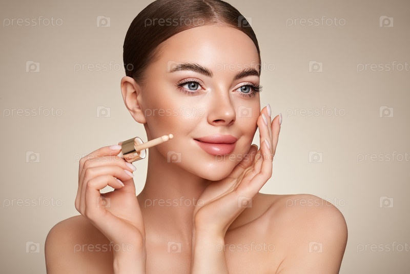 Портрет красивой молодой женщины с бутылкой основания