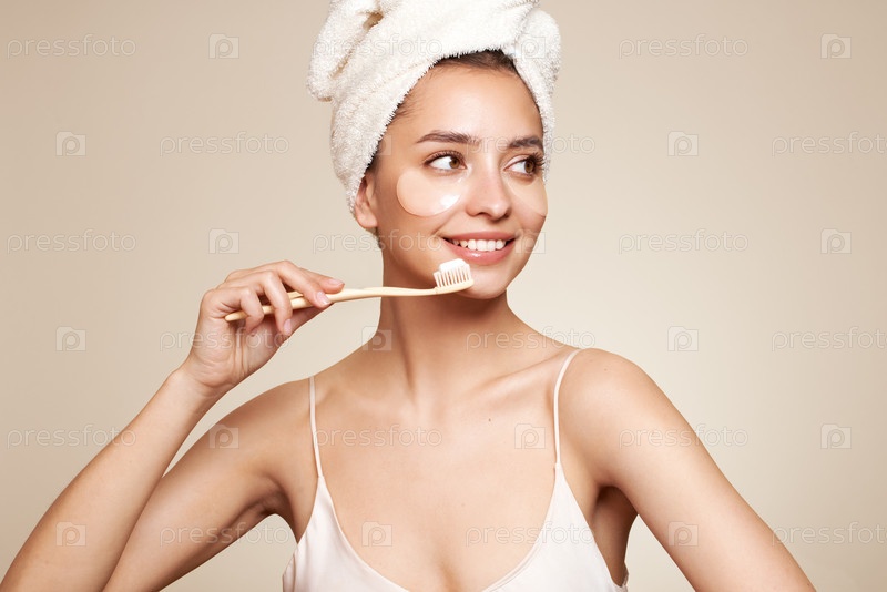 Молодая счастливая позитивная женщина чистит зубы